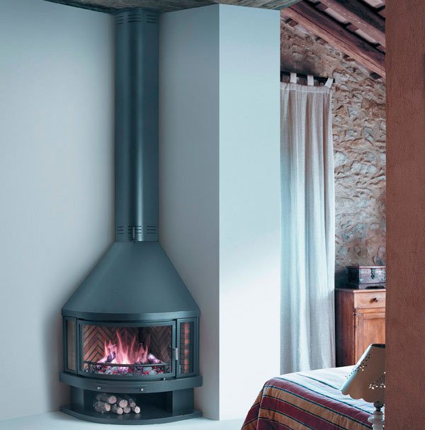 Круглый угловой металлический камин с дверцей. Топка из огнеупорного кирпича, укладка "елочкой". Зольник с решеткой. Ниша для дров. Снабжен телескопическим элементом, позволяющим варьировать высоту от 2,60 до 3,10 м (от потолка до пола) и крепежом к потолку, дымоход диаметром 20 см.