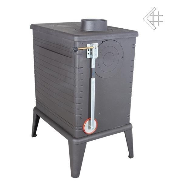 Финишное покрытие из термоустойчивой черной эмали. На фронтальной поверхности расположены две регулировочные ручки для управления первичным и вторичным воздухом. Внутри топочной камеры - держатель для дров.