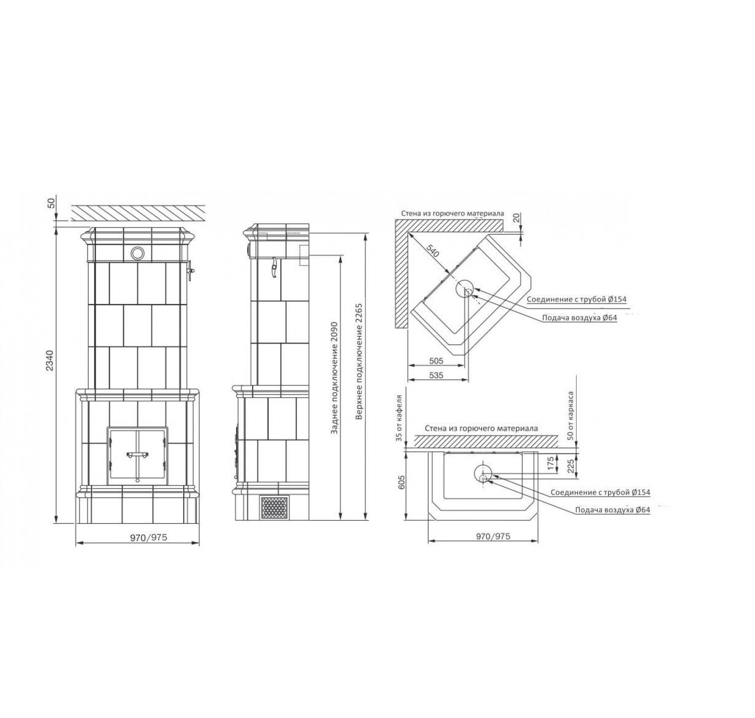 Топочная камера оснащена чугунной решеткой и дверцей, вынимающимся зольником и внутренней облицовкой из вермикулита. Теплонакопительная сердцевина печи состоит из оливина, люк - латунь. Отделка - бетон под покраску или штукатурку.