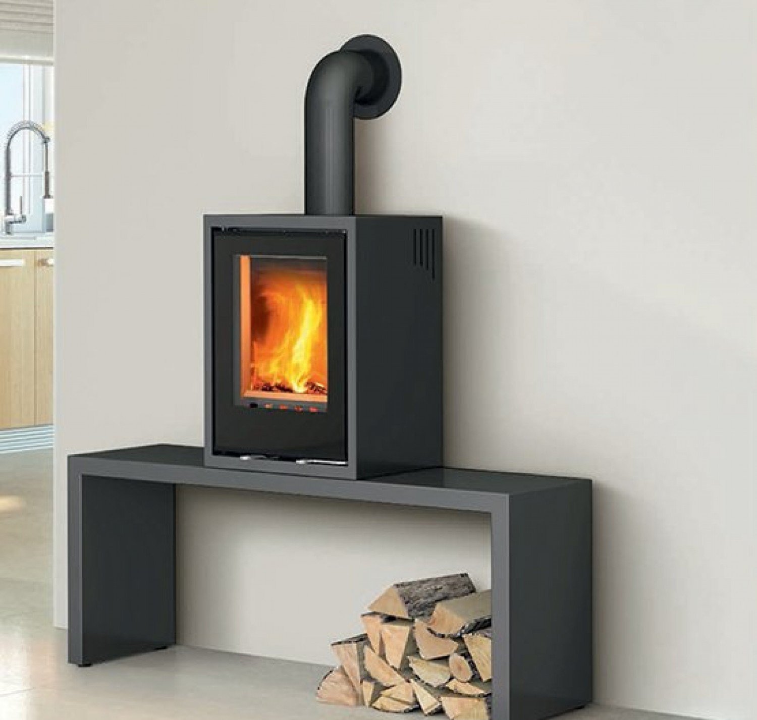 Данная печь может служить как вставкой в портал или каминную облицовку, так и отдельностоящей печью - для этого дополнительной опцией к этой печи предлагается приобрести базовые столешницы.