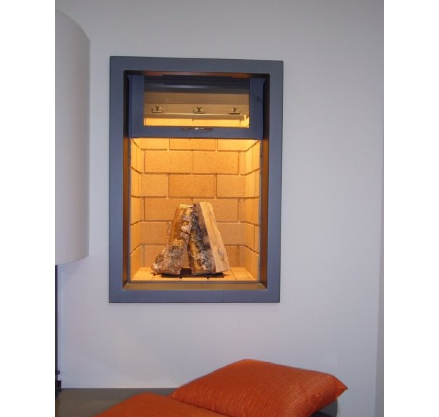 Дровяная каминная топка с прямым стеклом изготовлена из высококачественной стали, внутренняя часть которой футерована шамотом. Топка оснащена системой очистки стекла, встроенным шибером и системой подводки внешнего воздуха в камеру сгорания, а также оборудована цепным механизмом подъема двери, съемной колосниковой решеткой и ножками, которые дадут возможность установить топку на неровной поверхности.