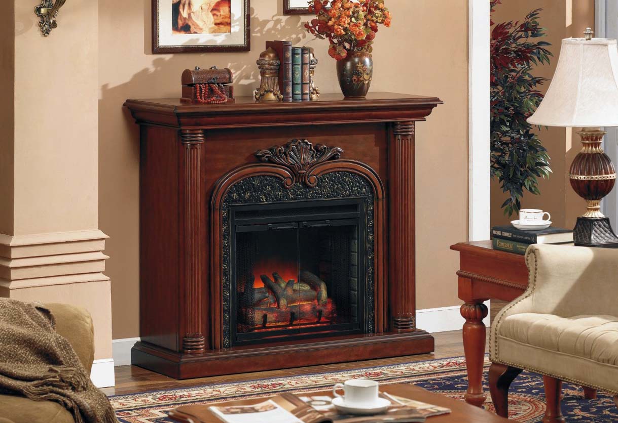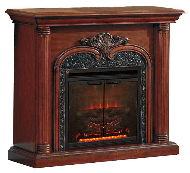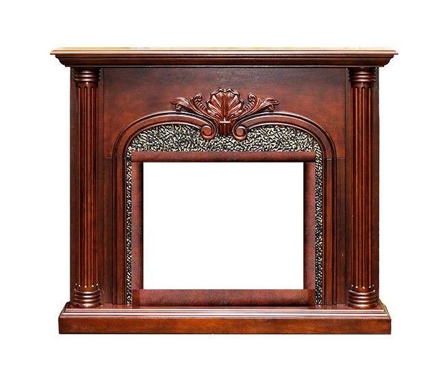 • Изящная резная отделка и панель под металл вокруг очага. Колонны делают обрамление более привлекательным. По центру портала красивый растительный узор.